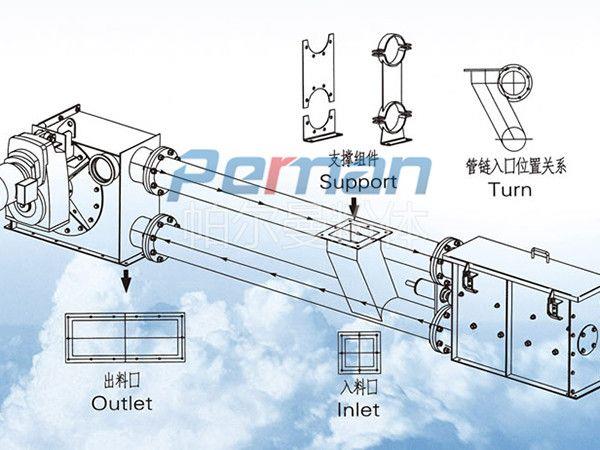 管鏈輸送機也被稱作管鏈式輸送機、管式輸送機、管道輸送機、鏈管輸送機等。是在密閉的管子內部進行運動的一個機械系統,在輸送系統中具有性能穩定、節省能耗、環保、密封的特點。可以連續輸送粉狀、膏狀、小顆粒狀及小塊狀等散狀物料,也可以水平、傾斜和垂直組合輸送。其廣泛應用于化工、化纖、農藥礦石、塑料、橡膠、糧食、煤粉、食品行業、建筑材料等各行業。