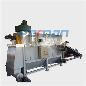 篩分裝置:篩分裝置中滾筒篩壁面布滿篩孔,篩板表面固定有可活動的6塊斜板,此斜板起到內(nèi)螺旋的作用。廢袋和物料進入滾筒篩內(nèi),滾筒篩低速旋轉(zhuǎn),加速物料透過篩孔落入錐斗內(nèi),廢袋由滾筒篩內(nèi)螺旋輸送到滾筒出口,并掉落到廢袋輸送機內(nèi)。
